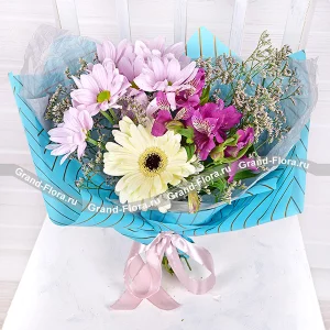 Небо в твоих глазах - букет-комплимент из герберы, хризантемы и альстромерии