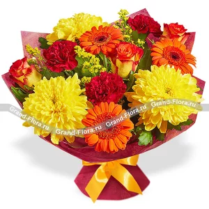 Солнечные объятия - букет из желтых хризантем и гвоздик