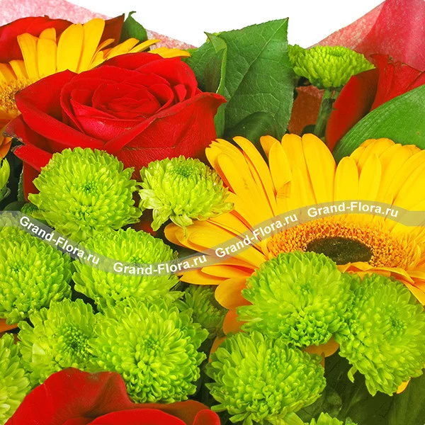 Буйство красок и романтическая нежность герберов, роз и хризантем делают этот букет ярким и запоминающимся. Зеленые хризантемы напоминают о чудесных весенних днях, желтые, как солнце герберы навевают мечты о лете, а красные розы, удачно вписанные в композицию, подводят завершающий итог. Этот великолепный дизайнерский шедевр понравится как молодой, так и замужней женщине.