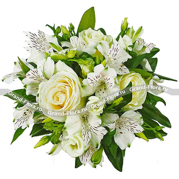 Стандартный (на фото): роза белая - 3 шт., альстромерия белая - 5 шт., эустома белая - 5 шт., салал, сетка зеленая. Примерный объем букета 30х30 см.