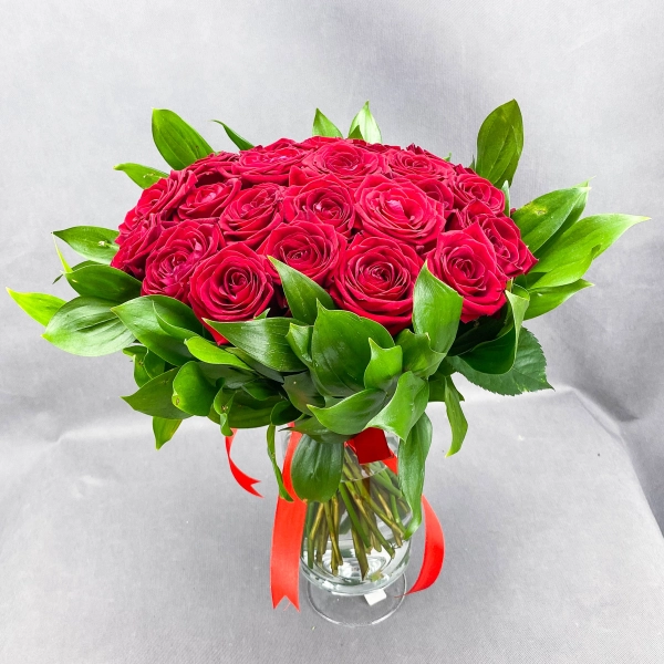 25 роз: роза красная (70см) - 25 шт., рускус (или салал) - 13 шт., упаковка, лента.