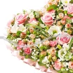 Стандартный: роза розовая - 4 шт., роза розовая кустовая - 4 шт., эустома белая - 3 шт., альстромерия - 3 шт., гипсофила - 2 шт., гвоздика кустовая розовая - 3 шт., декоративная зелень, фетр желтый, оазис.