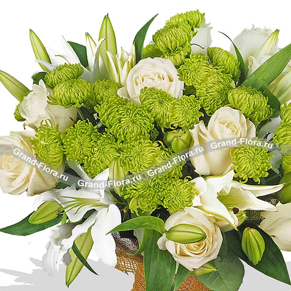 Стандартный: роза белая - 5 шт., лилия белая - 2 шт., хризантема одноголовая зеленая (шамрок) - 7 шт., сетка коричневая.