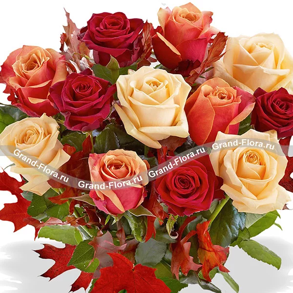 Выигрышное сочетание роз трех оттенков – нежного кремового, страстного красного и пленительного оранжевого – поможет выразить чувство благодарности и уважения. Дополненный осенними листьями букет не оставит равнодушной его получательницу