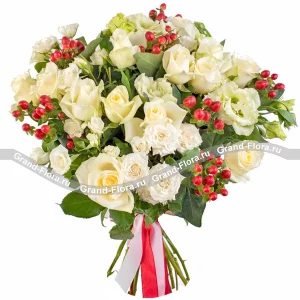 Букет из красных роз, гармонично дополненный рускусом и эвкалиптом, станет отличным поздравлением как для женщин, так и для мужчин.