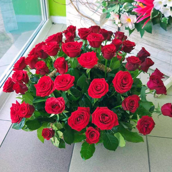 55 роз: роза красная - 55 шт., оазис, корзина.