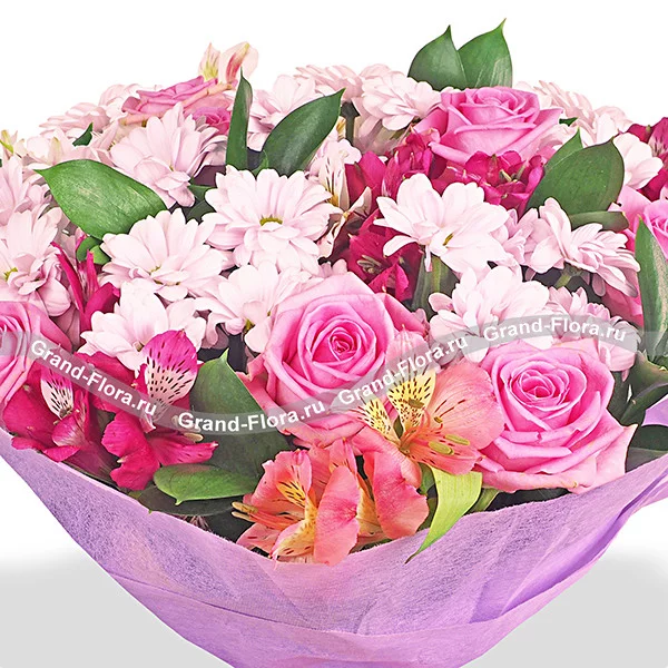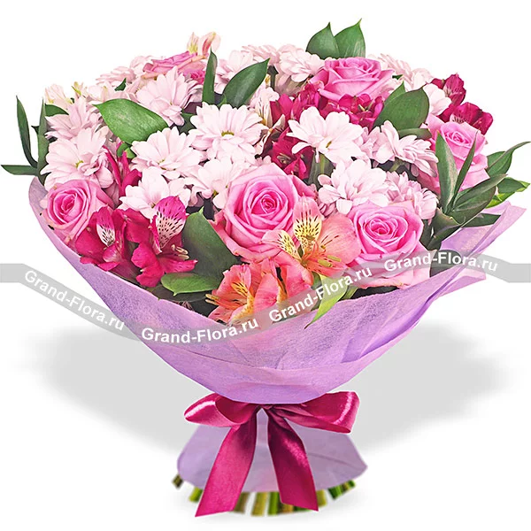 Люкс (на фото): роза розовая - 7 шт, хризантема кустовая светло-фиолетовая (возможна замена на белую) - 4 шт., альстромерия яркая - 3 шт, альстромерия розовая - 1 шт., упаковка, лента