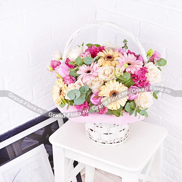 Стандартный: роза белая - 4 шт., гербера розовая - 1 шт., гербера желтая - 2 шт., тюльпан розовый - 3 шт., эустома розовая - 3 шт., эвкалипт, оазис, корзина. Примерный размер: 25Х30 см.