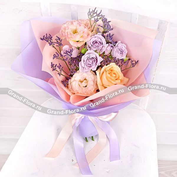 Чарующие и необыкновенные розы сиреневого и кремового  оттенка, розовая эустома и фиолетовый лимониум в букете выглядят гармонично, роскошно и привлекательно.