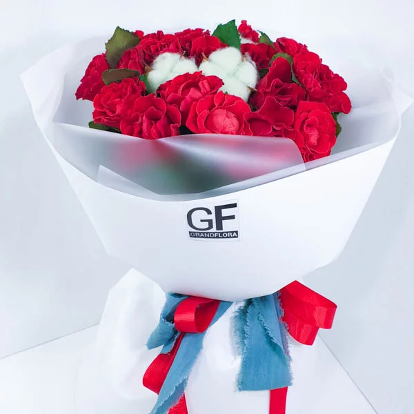 (на фото) роза кустовая красная - 15 шт,  хлопок (может быть заменен на декоративную зелень), упаковка, лента. Примерный размер: 35Х35 см.